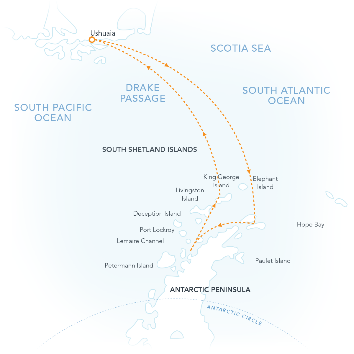 Sailing onward, we cross the famed Drake Passage – the body of water separating Patagonia and the Antarctic Peninsula. The Drake Passage is known for rollicking conditions and strong westerly winds, nicknamed the Roaring Fifties. While this passage may be challenging, you can rest comfortably aboard our expedition vessels, which are purpose-built with stabilizers, powerful engines and manned by a highly-qualified crew. The most spirited sailors consider Drake Passage a lifetime achievement – and you will complete the crossing twice!